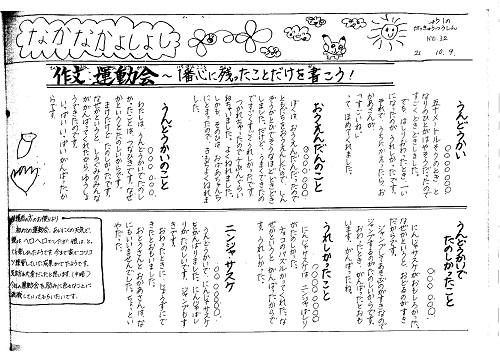 JUGEMテーマ:クラス作り *〜*〜*〜*〜*〜*〜*〜*〜*〜*〜*〜*〜*〜*〜* 運動会後の学級だより2 *〜*〜*〜*〜*〜*〜*〜*〜*〜*〜*〜*〜*〜*〜* ◆ついうっかり、近所の子の様子を見て、 運動会は来週だと思ってしまったので、 お呑気に学級だよりを進めていましたら、 ・なんと、 「先週終わりました。」 というご報告を受けまして、 間に合わなかったことに、 申し訳なく思いました。 すみませ...