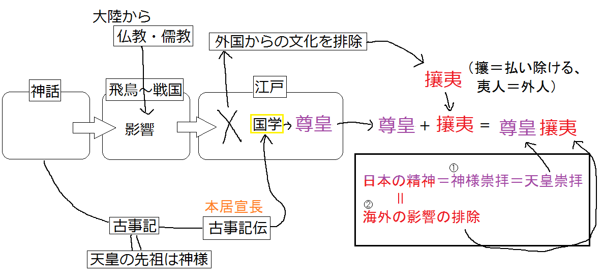JUGEMテーマ:中学生勉強法 中学2年の社会の教科書ですが、国学からの尊皇攘夷という流れがつかみにくいとのことで図解します。 まず、国学とは、 仏教や儒教研究を否定し、 「日本古来の精神」みたいなものの研究が良いんじゃないか、 という単なる主張だととらえます。 じゃあ、日本古来の精神とは、何か? それは古事記に書かれているような神々の世界の精神。・・・? その神々の子孫が天皇家(ここまでが古事記)。・・・? だから天皇を敬うし、大陸からの影響を受けないようにしよう。(...