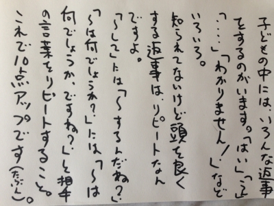 JUGEMテーマ:中学生勉強法 成績を上げるために、まだ教えてもらっていませんか? 人間には治癒能力が備わっているように、あなたのお子様にも知恵が備わっています。 やり方を習う必要はありません。 自分で到達する力が育つのを殺してしまってませんか? 映画を見る前に犯人を教えられていませんか? そんな映画、死ぬほどつまらないはず。 さて、お返事の仕方だけで、なんと理解度は上がるのですが、そもそも子供に備わった力を導き出すだけです。 そのためには、リピートです。 「これは、どうい...