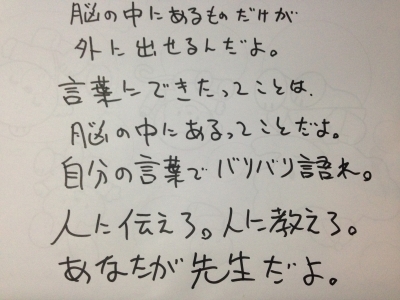 JUGEMテーマ:中学生勉強法 お勉強をだまって黙々とやっている人は、もったいない。 あなたは生徒のつもりでいるのだから。 人に教えれば先生だよ。 だから、人に教えれば生徒を卒業できるんだ。 しっかり、言葉にしてみよう。 書くだけじゃなく。 覚えるだけじゃなく。 先生は言葉にする。 同じように、あなたも言葉にして。 誰かに伝えるように、 独り占めしないように、 勉強をしよう。 生徒と先生は、どっちが良くわかっていると思う? 生徒と先生は、どっちが賢いような気がす...