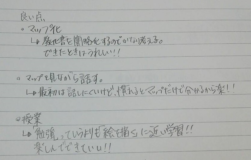 生徒さんから感想をいただきました。 「どう?」という質問に答えてくださいました。 マインドマップを作ることが刺激的なようです。 学校じゃやらないかも知れませんが、かなり有効な学習方法であるマインドマップ。 実は、この生徒さんにはマインドマップを教えておりません。 でも、それなりに作れてしまうのがマインドマップの直感的なとこです。 音読やマインドマップなど、普通は使わない脳の部分を使うことは、 かなりお勧めです。 JUGEMテーマ:中学生勉強法
