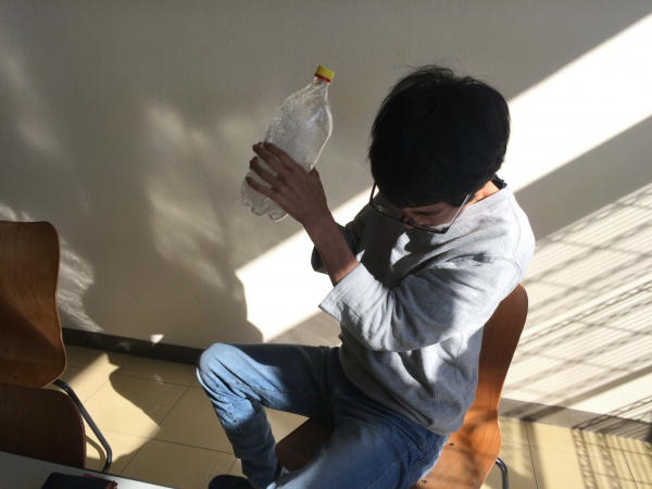 午後、教室をのぞくと、なにやら一生懸命にペットボトルを振っている人たちが。 実験を行っているようです。 「物理基礎」のスクーリングで、力学的エネルギー・熱エネルギーの学習を行っていました。 ペットボトルを振ることで、力学的エネルギーが発生します。 それが中に入っている水へと伝わり、熱エネルギーとして、水の温度を上昇させます。 水の量やペットボトルの容量、振り続ける時間など、 ...