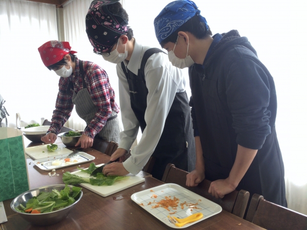 本日の家庭総合は調理実習です。 寒くなってきたこともあり、メニューは野菜たっぷりのシチュー。 さっそく、小食堂を覗いてみると・・・? 材料を切っている最中でした。 写真に写っている緑の野菜は、けさエンカレ畑から収穫してきた新鮮な白菜です。 前回のスクーリングで作成したレシピ。 グループに分かれ、役割分担しながら準備を進めます。 野菜を切って...