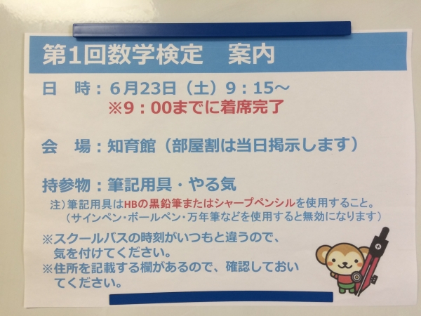 本日の午前中、第1回数学検定を実施しました。 エンカレッジコースでは、 今年度から検定取得のためのスクーリングを開講しています。 これまでの学習がどのくらい身についているか、 振り返る機会になったのではないでしょうか。 今後も、自分の学びを積み重ねていきましょう。 梅雨休みも残り1週間。 春期の学びをふり返り、しっかり力を蓄えて、夏期へ向かいましょう。