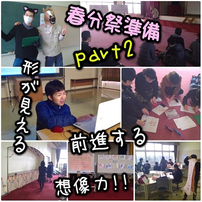 JUGEMテーマ:豊かな学びは夢を後押ししてくれる 単位認定試験が終わったら、いよいよ冬期終了行事。 その名も春分祭。 今年度の締めくくりの行事です。 2015年度のメンバーでの活動はこれが最後。 今年度の集大成を作り上げたい。 卒業年次生にとっても最後の活動。 春分祭の準備は2月24日から。 互いにの手と気持ちを重ねて合わせて歩みます。