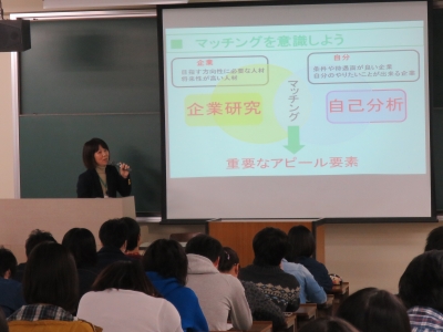 4年生を対象に本年度最初の就職活動準備セミナーを開催しました 講師には、ハローワーク高知学卒ジョブサポーターの山岡智子さんを、 お招きしました 就職活動をするにあたっては企業研究、業界研究に加え自己分析が 重要です。日頃から新聞に目を通すなど、自分の目指す業界、職種 の現状を把握することや、過去の自分を振り返り、自分を客観視で きる能力を身に付けることが大事であると強調していました また、山岡さんは社会人基礎力の3つの能力 ・前に踏み出す力(アクション)・考え抜く力(ヘッ...