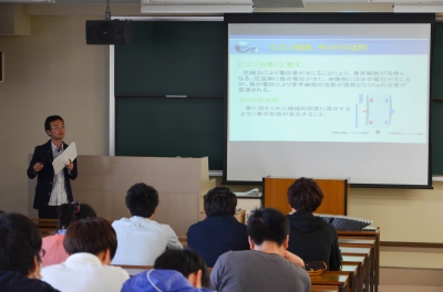 理学療法学科、ある日の竹林先生の授業風景を紹介します 〜竹林先生から学生に対してのメッセージ〜 “日常生活の中にテーマはたくさん転がっています。常に考えてい る事が大事、発想はいろんなところから生まれてきます。思いつ いたら即メモ、ちょっとした思い付きでも良いのでキーワードを いくつも見つけて、研究テーマを一緒に見つけていきましょう。” 4年生が卒論で取り組んでいる研究について、パワーポイント等を 使って発表します。この研究を始めたきっかけ、どのように進め ているか、今後...
