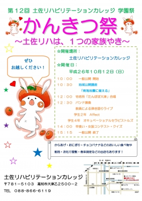 土佐リハ学園祭「かんきつ祭」 開催決定のお知らせ 台風接近のため、開催を検討しておりました、 本校学園祭「かんきつ祭」は 通常通り10月12日(日)に開催致します 皆様お気をつけてお越し下さい 皆様のお越しをお待ちしております =============================== ☆2014年度オープンキャンパス開催! 平成26年11月22日(土)受付開始:10時30分〜 (事前予約不要) 〔開催内容〕 ・学校紹介 ・入試説明(指...