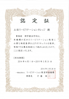 土佐リハビリテーションカレッジは4月1日、 一般社団法人リハビリテーション教育評価機構の 認定を受けました 高知県内で初めてとなる今回の認定では、 本校教員の学術研鑽や教育活動が高く評価されました 病院・福祉施設等で即戦力となるリハビリテーション医療の 専門家を育成するためには、教育の充実が不可欠です 本校は開校以来、高度な知識・技術を持ったセラピストを 育成するため、教員の学術活動にも力を注いでいます 教員は講義や実習科目を担当する傍ら、更なる専門性と 指導力の向上...