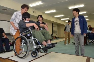 理学療法学科・作業療法学科の1年生は 5月上旬から下旬にかけて、 車いす体験と その介助法について学んでいます 授業では、階段や砂利道、急な坂道など、 様々な条件を想定して演習が行われています 21日に行われた作業療法学科の授業では、 階段の場面で、ティッピングレバーと呼ばれる部分を踏んで 前輪を上げたり、また2人で介助して車いすを持ち上げたり するなど、操作方法を確認しました 学生たちは車いすに乗っている人に「安心感」を もってもらえるよう、 声のかけ方や安...