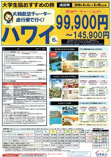 大韓航空チャーター直行便で行く! 日本旅行 ハワイ6日間!(燃油サーチャージ込み) 真夏の太陽、白い砂浜ビーチで、優雅なひと時を楽しみませんか? 夏の海外1位は、ハワイ オアフ島です!! 教職員の方にもおすすめです。 ぜひ、ご家族でお出かけください! おすすめホテル ?ワイキキ・サンドヴィラ・ホテル …アラワイ運河に面したカジュアルホテル! ?シェラトン・プリンセス・カイウラニ …ワイキキの中心に建つ最高のロケーション! ?シェラト...