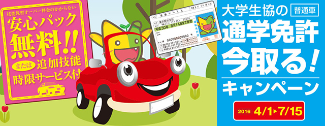 大学生協の通学免許 今取るキャンペーン開催中! キャンペーン期間:2016年7月15日まで この時期は、教習所がまだ若干空いていて、料金もお得です 今なら安心パック(技能教習オーバー料金不要)が無料で付けられます!(※ 対象校限定) また、終了検定までのスケジュールプラン作成も無料で対応!(※ 対象校限定) 教習所オリジナルサービスもあります。(※ 対象校限定) これから始まる夏休みは、教習所が大変混雑します その前に、着実に免許を取得しましょう! そして、夏休みは取った免許で、...