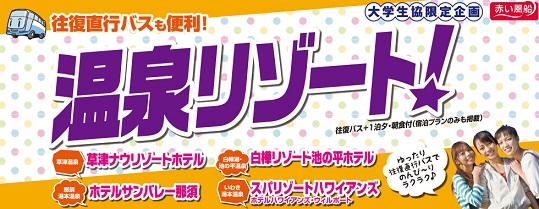 大学生協限定企画!温泉リゾート! 〜往復直行バスも便利!〜 往復バス+1泊夕・朝食付き(宿泊プランのみも掲載) 温泉リゾートが満喫できる4つのお宿プラン。 充実のラインナップからお選びください。 お友達やご家族でのご旅行にお勧めいたします! おすすめ4つのお宿プラン ●草津温泉:草津ナウリゾートホテル …草津温泉を楽しめるビッグバスと厳選されたビュッフェ料理が大人気! ●那須湯本温泉:ホテルサンバレー那須 …お風呂とスパで楽しさいっぱい温...