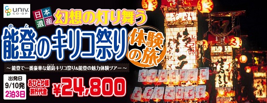 日本遺産 幻想の灯り舞う! 能登のキリコ祭り 体験の旅 3日間! お一人様 24,800円(税込) 出発日:2016年9月10日(土)出発の2泊3日 定員:20名様限定!モニターツアー 能登で一番豪華な蛸島キリコ祭り&能登の魅力体験ツアーです。 往復ANA利用(羽田発着)となります。 行程内、全食事付き(朝2回・昼3回・夕2回)で安心! おすすめポイント <蛸島キリコ祭り> 200余年の歴史がある高倉彦神社の秋祭り。 総漆塗りで豪華な彫刻が施されたキリコは、 能登のキリ...