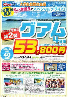 Ciao(H.I.S.)×大学生協限定企画 第2弾 グアム4日間(燃油サーチャージ込み) 出発日限定の早い者勝ちのスペシャルプライス! 好評につき、第2弾増席しました。 もちろん、燃油サーチャージ込みなのでお得です! 先着順ですので、お申込みはお早めに!! H.I.S.はここが違う! ?レアレアトロリー滞在中乗り放題! ?レアレアラウンジが滞在をサポート! ?街中で使える無料Wi-Fiのパスワード付与! ?友達との思い出を作ろう!オプショナルツアー多数あり。 …...