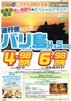 Ciao(H.I.S.)×大学生協限定企画 直行便で行く!バリ島5日間(燃油サーチャージ込み) 出発日限定の早い者勝ちのスペシャルプライス! 新たなプランを追加販売しました。 もちろん、燃油サーチャージ込みです! 人気のコースですので、お申込みはお早めに!! ホテルのランクアップも可能です。(※ 別途追加料金) H.I.S.はここが違う! ?マイマイシャトル乗り放題! …クタ・スミニャックなどの繁華街を巡るシャトルに加えて、 山のリゾートウブドまでのシャ...