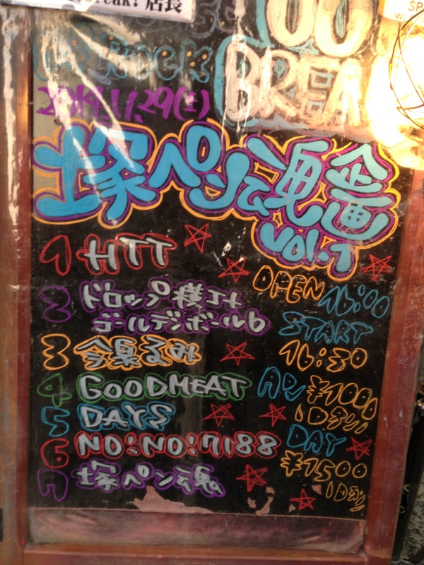 JUGEMテーマ:音楽 JUGEMテーマ:エンターテイメント JUGEMテーマ:思い出のひきだし 11月29日(土) 四谷アウトブレイクにて塚ペン魂企画開催。 『塚ペン魂』とは? それは、スタジオペンタ大塚店有志で結成された、 グループ魂のコピーバンド。 しかし、中途半端なそれとは違う・・・ やるなら徹底的に!! パフォーマンス究めるフロント陣と、演奏力高いバンド陣。 彼らのステージはこちら↓ https://m.youtube.com/watch?v=8GFXwM8rYU8 ・・・という事で、 秋深まりし11月最後の土曜日。 奇妙な・...