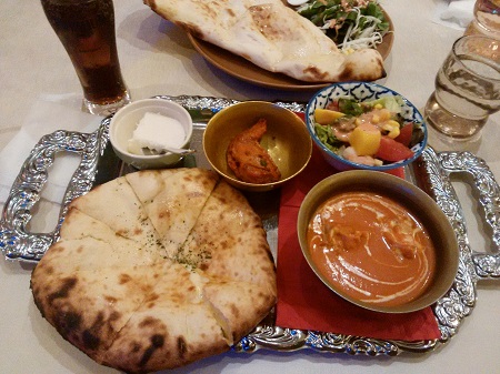 JUGEMテーマ:今日の一枚 4/30(日)、 トムボーイ106モアイカフェ(渋谷道玄坂店)へ行ってきました♪ 注文したのは、 リッチバターチキンカレー!!¥990 人気No1だそうです。 左上から;ミルク寒天のココナッツのせ、タンドリーチキン、完熟マンゴーと小エビのサラダ 左下から;ナン、バターチキンカレー このナン、