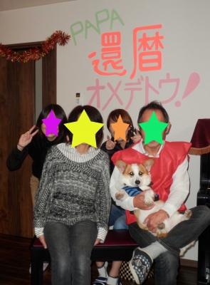 JUGEMテーマ:冬の楽しみJUGEMテーマ:コーギー 小学生の夏休みの絵日記やないけれど・・・・・ジャックのお誕生日の今日。。。チョイトまとめ書きをいたしたいと思いますまずは パパしゃんの ◎暦祝い のお写真からおっとっとー!せっかく◎でかくしたというのに 壁にデカデカと赤い文字が・・・・・そうなのです。10月30日をもって パパしゃんは満60歳にパパしゃんが着ている赤いちゃんちゃんこらしきもものは姉たちからのプレゼントの袋。。。。ハサミとセロテープで作られたちゃんちゃんこらしきものなのですパパしゃん...