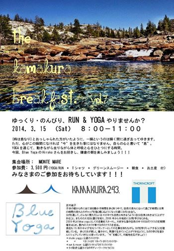 今週末鎌倉で海yogaしますthe kamakura breakfastさんとのコラボレーション!RUN&YOGA&朝ごはん♪お天気になるといいな〜 【日時】3月15日(土曜日)8:00〜11:00頃 【場所】集合場所: MONTE MARERUNは長谷〜由比ガ浜周辺YOGAは由比ガ浜を望む芝生の上で行います(詳細は当日をお楽しみに★) 【参加費】¥3500-走ってヨガをして締めくくりはスムージーと朝ごはん午後は鎌倉散策?芝生でお昼寝?一日のんびり楽しんでもらえたら嬉しいですお申し込み・詳細はthe kamakura breakfastさんFBよりからになりますがいつものblue yoga...
