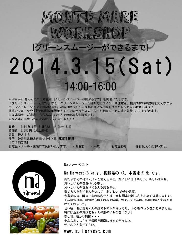 ブログで告知させていただいた週末のイベント集合場所 & breakfast をいただく長谷 MONTE MARE さんで午後にもイベントがあるんですよ〜我が家の冷蔵庫のを喜びで満たしてくれるNa harvest さんのお野菜を使った"GREEN SUMOOTHIE" WS美味しいお野菜で作る栄養がいっぱいのグリーンスムージーお散歩がてら美味しい♪の寄り道いかがでしょ?詳細はこちらから⇒monte mare FBHIROKO