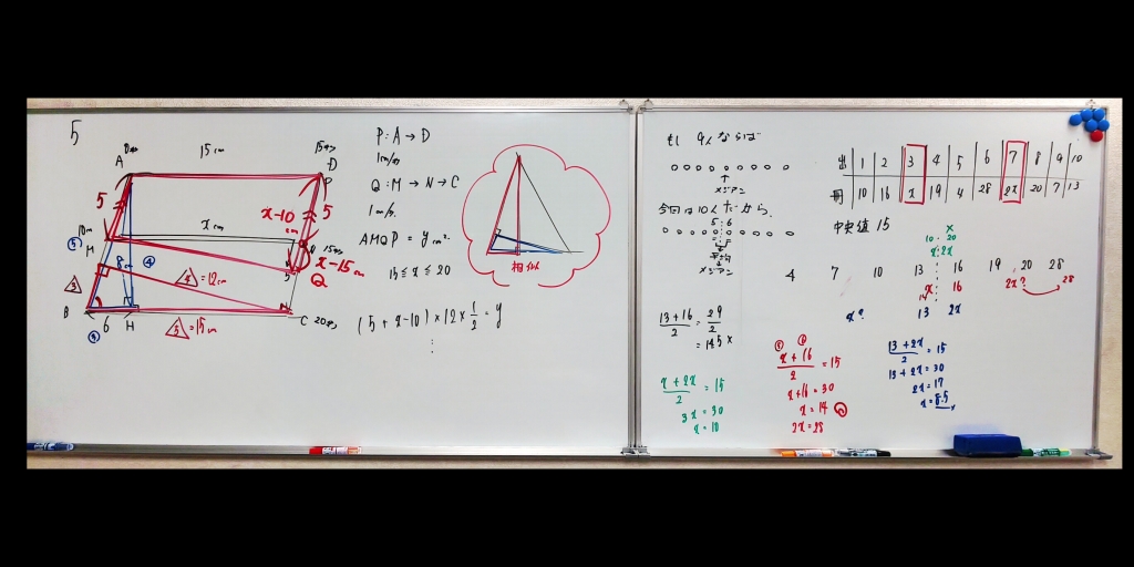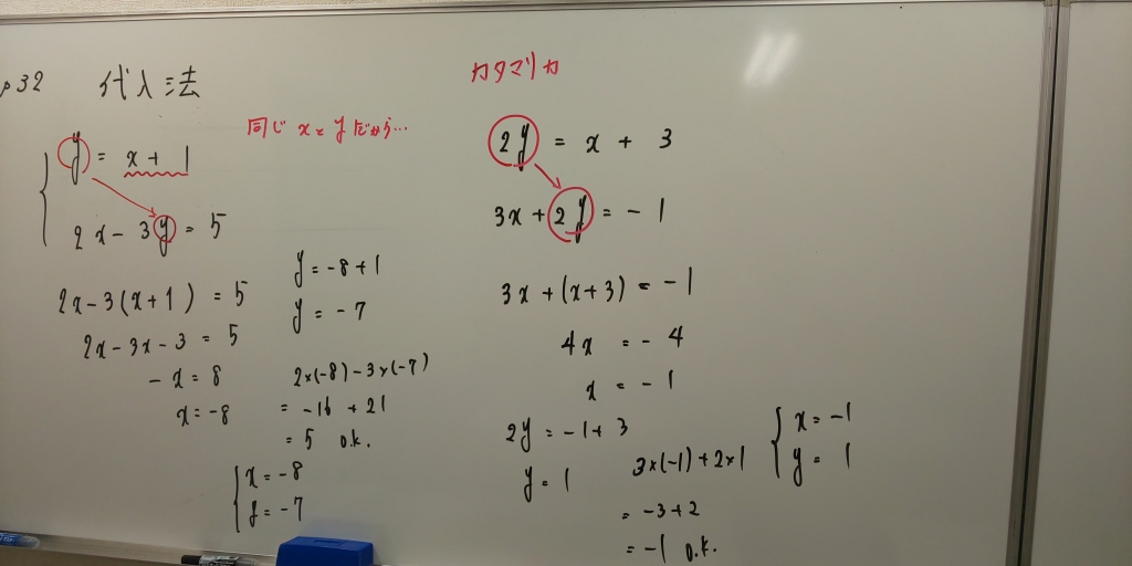 JUGEMテーマ:高校受験 今現在、 イーズ春日教室高橋塾の中1数学は2クラス編成になっています。 sクラス→学校のペースに合わせて hクラス→ぐいぐい進む という感じです。 私は木曜日にhクラスの授業を担当しています。 実際の板書です。 そう、もう 連立方程式に突入しました。 中2の6月くらいの内容です。 受講している生徒はがんばっています。 (先生ががんばるのはアタリマエ) 大学受験まで考...