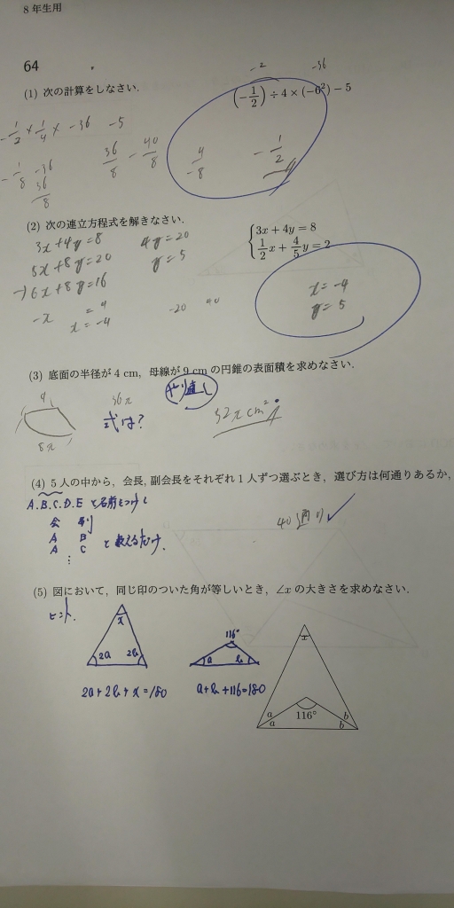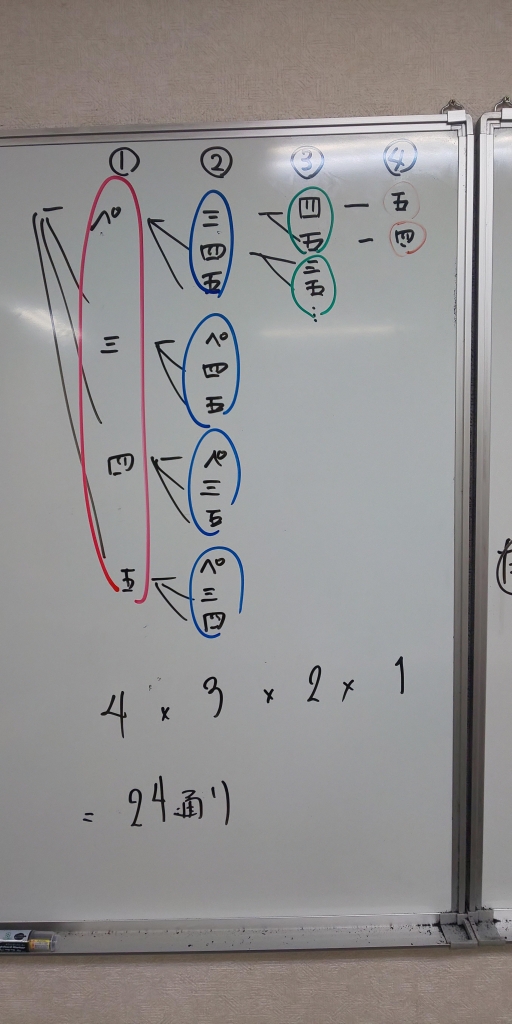 JUGEMテーマ:高校受験 今日は中2数学sクラス。 今は樹形図の練習。 何度でも大事だから書きたいことなのですが、 樹形図は書く これが後の計算で解く方法を習得する土台となるからです。 上の写真は 「前から書く」 方法を採用しています。 1番目の人は4通り、2番目の人は3通り・・・という感じです。 計算式に直結させるにはこれがいいと思います。 でも、 初めのころは 「後ろから書く」 方法もありですね。 (...