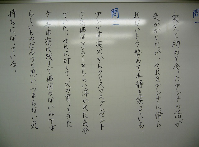 JUGEMテーマ:中学受験 昨日紹介した『家族のヒミツ』の記述解答例を公開します。 ごらんください。 ホワイトボードに解答を書き付けたのですが、蛍光灯の光が邪魔していますね…。