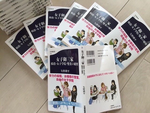 JUGEMテーマ:中学受験 一昨日、文藝春秋より我が家に荷物がどさっと届く。 そう、10月20日(火)に発売されるわたしの新刊『女子御三家 桜蔭・女子学院・雙葉の秘密』(文春新書)の見本である。 本を出す前後のタイミングで嬉しく思う瞬間がある。 わたしの場合は、この見本が到着してそれを手にしたときと、書店で自著が並んでいるのを見るときである。 というわけで、昨日の午前中は家のベッドでゴロゴロしながら、「この本を読んでいるのは世界で俺だけだぜ」などという意味不明...