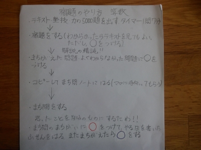 どうもうまく画像が貼れません・・・。(><) 楽天ブログのようにでっかく貼る。 アメブロのようにクリックで大きくなる。という方法が無いか探してみたのですが見つけられず・・。 今回は娘が立てた宿題の方法 算数編です。 これは塾の宿題を100%活かす! 分かっているつもりにならない!ことを目指しております。 宿題のやり方 算数 ・塾のテキスト(宿題)、塾技、力の5000を机の上に出す。 ・タイマーは1問7分 ・宿題をする(分からなかったらテキストを見ても良い。ただし印をつける) ↓ ...