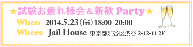 司法試験受験生の皆さま 長い試験、本当にお疲れ様でした さて、ビギナーズ・ネットでは司法試験を受け終えた受験生を対象にお疲れ様会を行います 詳細は以下の通りです。 【場所】 Jail House(ジェイルハウス) JR渋谷駅東口 徒歩7分/地下鉄銀座線表参道駅B3出口 徒歩10分 渋谷駅から572m http://tabelog.com/tokyo/A1303/A130301/13031764/ 【会費】 受験生は1000円(食事+飲み放題) 事前申込制:下記参照 当日はビギナーズの弁護士も多く出席し...