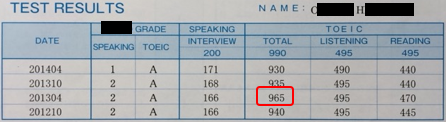 ※TOEICは、私が勤めていた会社で受験したIPテストです。 ※「会話レベル」は、私が勤めていた会社独自のもので、英検二次試験と似ており、英語母国語者による面接試験で評価されます(満点は200点)。 =会話レベルの基準= ■会話レベル1:(最上位) 広範囲な事柄で自由に自己表現ができ、担当分野での複雑な問題の議論、難しい折衝も可能。ニュースや講演の内容を正確に伝達でき、海外勤務も不自由がない。 ■会話レベル2: 通常の一般会話は正確に理解でき応答も流暢。細かいニュアンスなどを見落と...