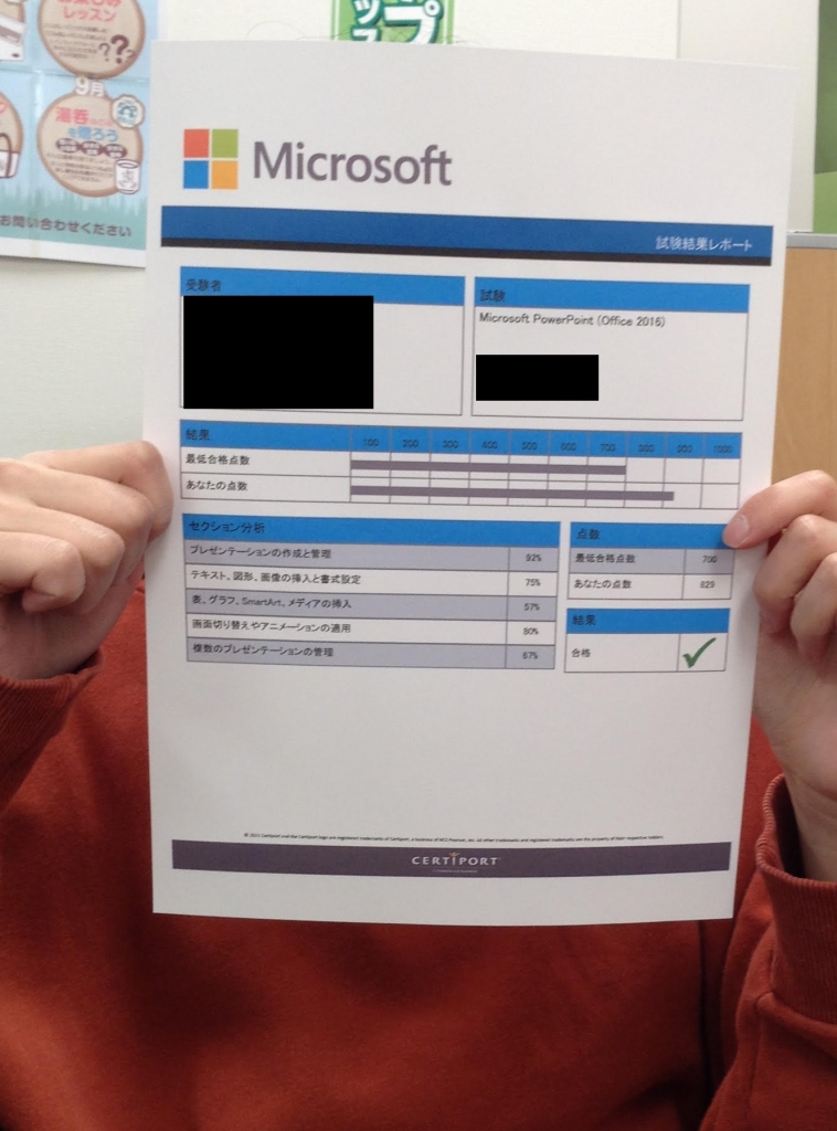 こんにちは! 札幌市北区と石狩市のハロー!パソコン教室 イトーヨーカドー屯田校 インストラクターの柴野です!! 先日合格したKさんの合格体験記となります! Kさんは2年前に入会し、将来の就職で困らない為に資格取得を目指しました その結果仕事での最重要資格であるMOSへ合格!! 今回はPowerPointのMOS資格である Microsoft Office Specialist PowerPoint2016 と、言う資格を取得されました!! ...