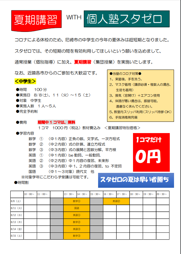 JUGEMテーマ:塾 コロナによる休校のため、尼崎市の中学生の今年の夏休みは超短期となりました。 スタゼロでは、その短期の間を有効利用してほしいという願いを込めまして、 通常授業(個別指導)に加え、夏期講習(集団授業)を実施いたします。 なお、近隣各市からのご参加も大歓迎です。 当塾は、阪急武庫之荘駅から徒歩3分という交通の便のよい立地です。 期間中、1コマは無料となります。1コマだけでもOKです。 <中学生> ●時間 100分 ●実施...