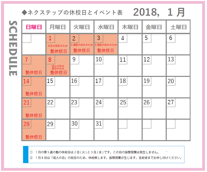 JUGEMテーマ:塾 みなさんこんにちは。 寒い日が続きますが、体調を崩さずに日々を過ごせていますでしょうか。 勉強もそうですが、体調管理もみなさんの立派な仕事ですよ。 インフルエンザなどにかからないよう、手洗いうがいを徹底してきましょう。 さて今回は1月のカレンダーをお知らせします。 ※1/8日は成人の日のため、休校となります。 月曜日にお通いの生徒さんは各校舎まで振替の連絡をお願い致します。 &nb...