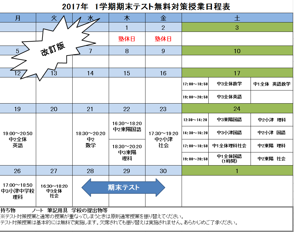 JUGEMテーマ:塾 泉大津市 松ノ浜 みなさんこんにちは。 いよいよ梅雨入りとなり じめじめとした天気が続くようになる季節になりました。(書いている今日は晴れていますが笑) さて、中学生のみなさんは期末テストがいよいよ月末に迫ってきました。 テスト前といえば、そうです!テスト対策です! ということで、例のごとく今回もテスト対策のネクストプラスを行います。 下がその日程となりますので、 参加できるところはきっちり参加す...