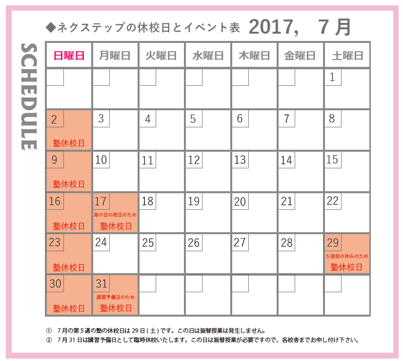JUGEMテーマ:塾 みなさんこんにちは。 中学生の皆さんは、期末テストがもう来週に迫ってきていますが、 しっかりと準備はできてきていますか? 毎度毎度提出物に追われるだけで、 それ以上の勉強をしていかないと結果はついてはきませんよ? さて、今回は7月のカレンダーをお知らせします。 早いもので、この前4月になったと思っていたらもう3ヶ月近くも経ってしまいました。 もうすぐ夏休みになりますが、この長い休...
