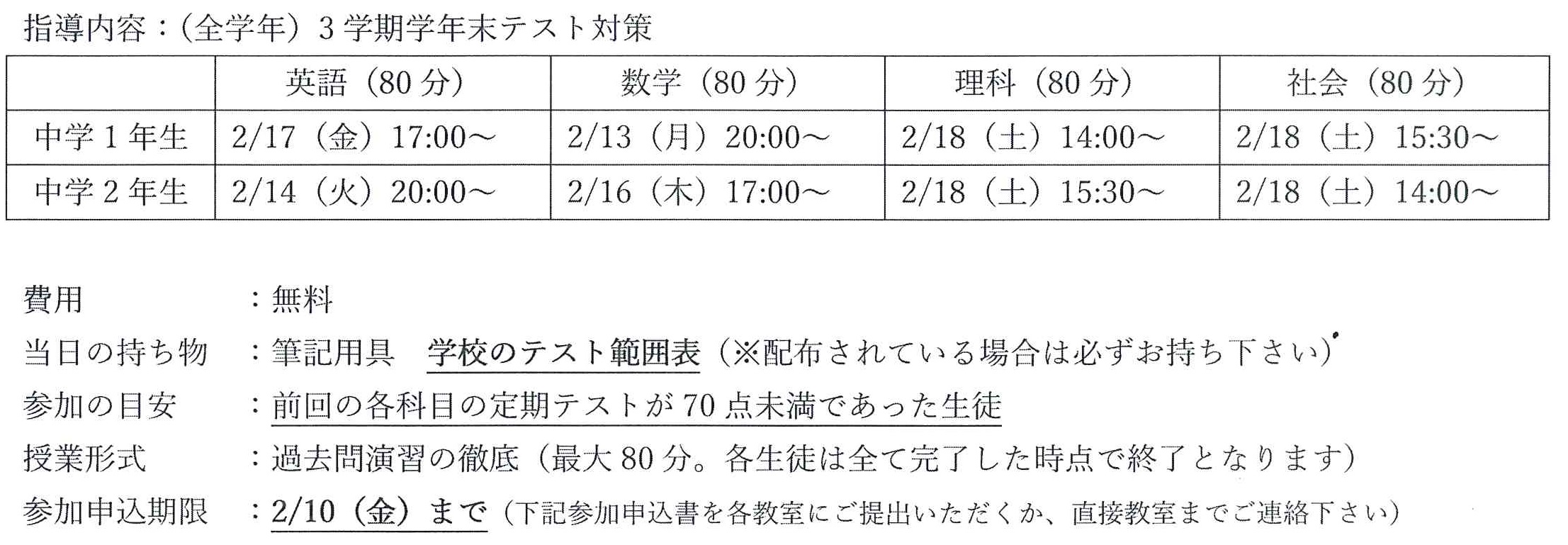 JUGEMテーマ:塾 みなさんこんにちは 2月になり、いよいよ私立高校の入試まであと一週間になりました。 本番で全力を出し切れるようにくれぐれも体調には注意しましょう。 特に今の時期はインフルエンザが流行しているのでしっかりとした予防をしておいてください。 さて、今回は松ノ浜校の中学生の様子です。 東陽中と小津中では、中3生は「卒業テスト」が中2生・中1生は「実力テスト」が行われています。 テスト週間ですので多くの生徒さんが、塾へ勉強をしにきています。 ...