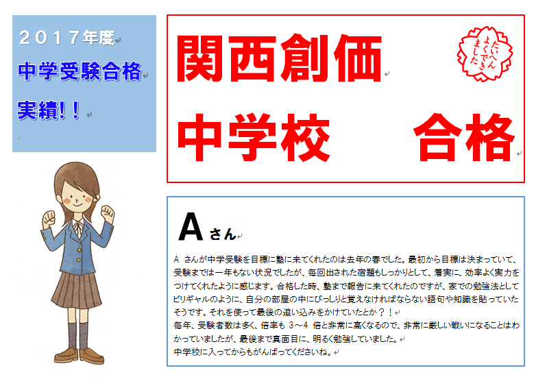 JUGEMテーマ:塾 みなさんこんにちは。 大阪でも雪が降るというほど寒い日が続いていますがいかがお過ごしでしょうか。 受験生はもとより、生徒の皆さんにはより一層体調管理には気をつかってほしいと思います。 さて、今週の木曜日にうれしい報告がありました! 中学受験の6年生の女の子が見事に合格しました!!! 去年の春から必死に勉強し、塾以外でも自宅できっちりと勉強していた努力家です。 自分の部...