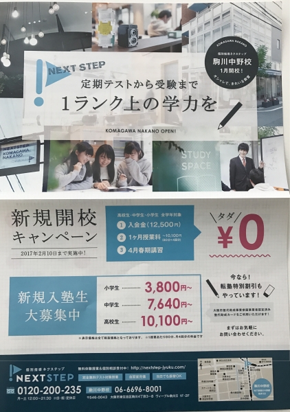 JUGEMテーマ:塾 皆さんこんにちは。 今回は先日開校した駒川中野校のお知らせです。 現在駒川中野校は先日お伝えしたように内装も完成し、開校準備が整いました。 ということで現在新規入塾生を大募集中。 今週には近隣にお住いの方にチラシを配布させていただきました。 新規開校ということで開校キャンペーンを実施中。 その内容は、 入会金 無料 1か月授業料 (80分4回分) 無料 ...