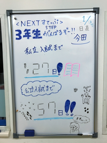 JUGEMテーマ:塾 (大東市:住道校, 泉大津市:松ノ浜校, 大阪市住吉区:あびこ校, 東住吉区:駒川中野校 共通) さてさて、冬休みが終わり、1週間がすぎました。 一番寒い時期になりましたが、受験はこれからですね! 先日 あびこ校の中3生の生徒達が 「入試まで後○日!」 というものをホワイトボードに書いていて、 自分たちで入試までの残りの日にちを意識しているのだなーと思い少し感心しました。 ...