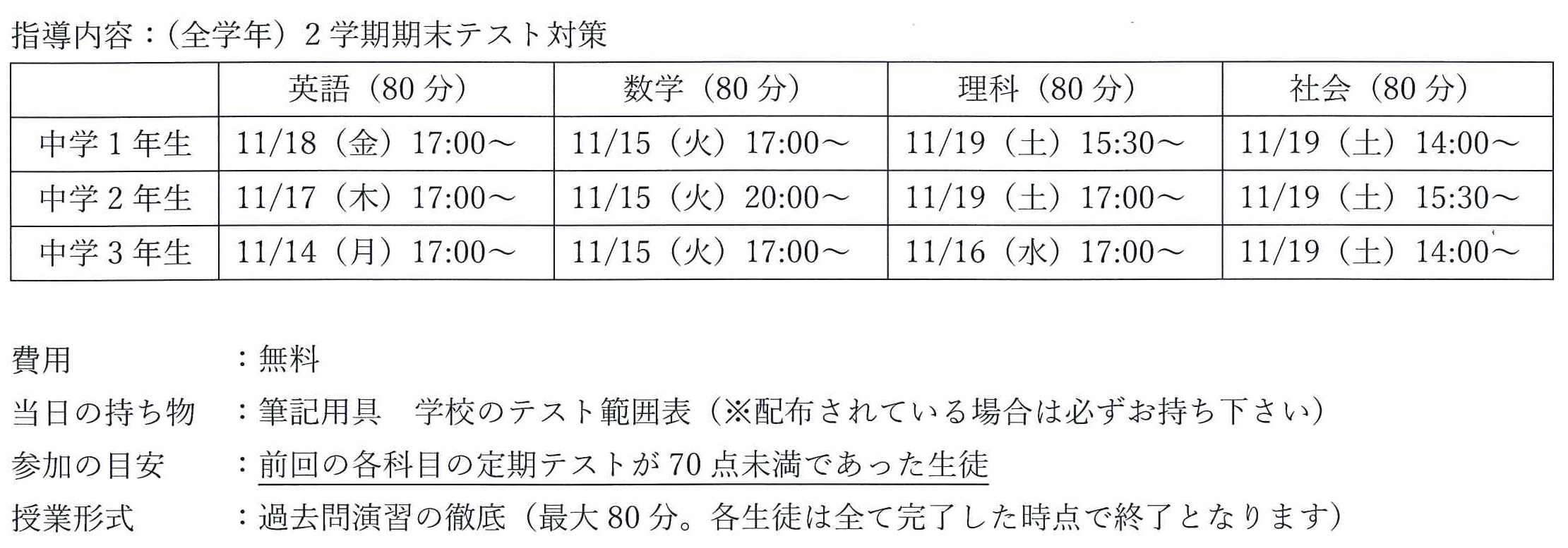 JUGEMテーマ:塾 さてさて、二学期期末テストが近づいてきました。 前回から新しくなった無料テスト対策授業『ネクスト+(プラス)』ですが、 以下の日程で実施します!(住道校版) ※住道校のネクストプラス! 参加の目安は 『前回の定期テストが70点未満であった生徒』ですが、 特製のテスト対策プリントもありますので、希望者はどしどし参加しましょう!( ˘ω˘)スヤァ &...
