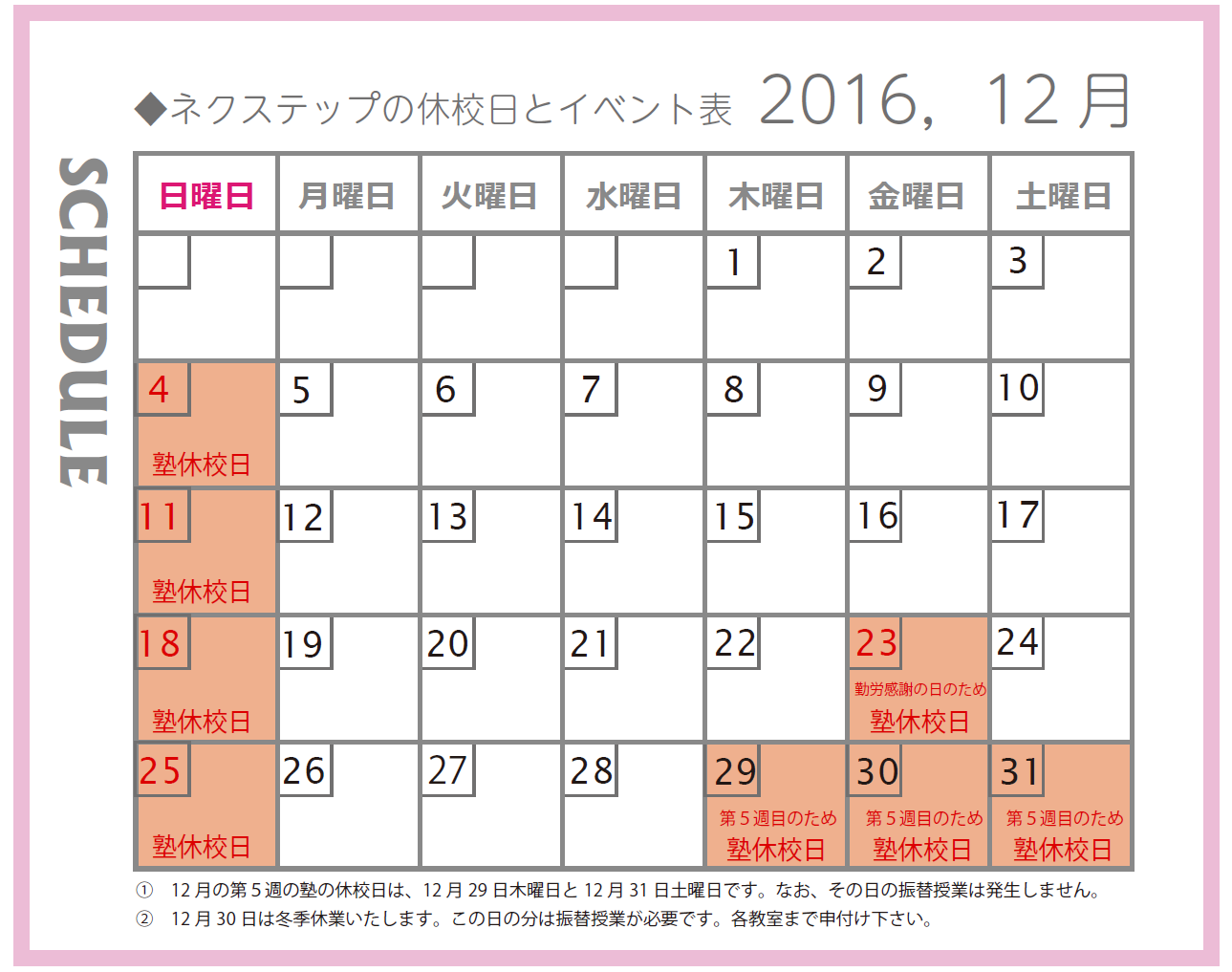 JUGEMテーマ:塾 みなさんこんにちは。 気づけば11月ももう2週が過ぎようとしていますが、体調を崩してなどいないでしょうか。 各校舎で少しずつ風邪など、体調不良でのお休みが増えてきています。 日々の予防を行って体調には十分気を付けてください。 さて、すこし早いですが 全校共通の12月のカレンダーをお知らせします。 ※木曜の生徒さんは1回振替が発生します。 各教室に希望日を連絡してください。 ...