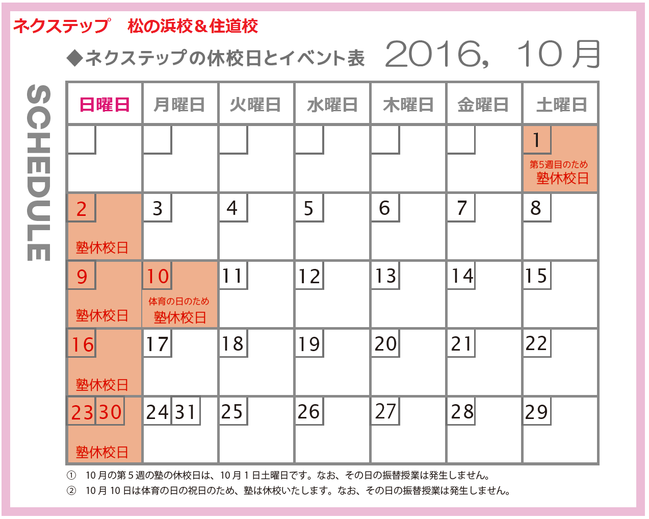 JUGEMテーマ:塾 さてさて、もう10月です! 夏休みが終わってあっという間にもう秋! それにしても、ジメジメと嫌な天気が続く今日この頃です... ということで、10月の休校日 カレンダー です。 塾生はしっかりチェックしておいてください! [大東市:住道校 ] [泉大津市:松ノ浜校][大阪市 :あびこ校] 3校舎で 休校日が異なるのでご注意下さい!