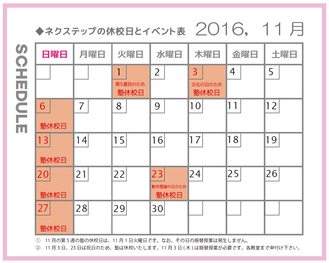JUGEMテーマ:塾 10月も半ばに差し掛かって、よーうやく涼しくなってきました。( ;∀;) でも、このちょーど 良い気候が続くのが11月までの数週間なんですよね,,,, その後は、一気に寒くなって冬の到来です.. このちょうどいい気候の時期に生徒諸君には、より一層、勉学に励んでほしいと思います。 ということで、11月のカレンダーを早めにお知らせいたします。 ※木曜日に通...