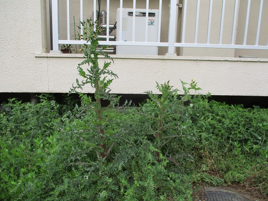 JUGEMテーマ:植物・雑草   お客様より また 駐車場 草が 伸びてきているので お願いしますとの ことで えっ? この間 除草剤 散布して 除草作業を したのにと 思い 現場に 行きますと・・・・・・・・・       なんじゃ こりゃ!   前回枯れた雑草の上から また はえてきておりました。   7月の毎日のように雨が降ったときに成長して 8月の水不足のときには 水をやらないいと育たない花を押し倒し 勢いよく のびている。    ...