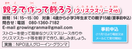 川崎市では、川崎市子どもの権利に関する条例第5条により11月20日を「かわさき子どもの権利の日」として、毎年この時期に「かわさき子どもの権利の日のつどい」を実施しています。 今年は、宮前市民館で開催します! つどいに参加して「子どもの権利」について、楽しみながら一緒に理解を深めましょう。 グローイングランマはクリスマスリース作りをします。 http://www.city.kawasaki.jp/450/page/0000067236.html