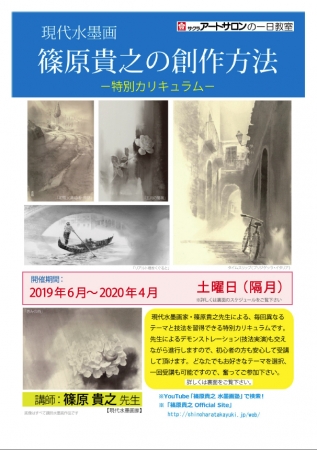 JUGEMテーマ:水墨画を学ぶ 2019年6月より大阪梅田サクラアートサロンにて定期講習会を開催することになりました。 毎回異なるテーマで篠原貴之の創作方法を、実演を交えて解説する特別カリキュラムです。 初心者の方を前提に説明してゆきますので経験の無い方も安心して受講下さい。また一回だけの受講も可能ですので,水墨画の世界をちょっと覗いてみたいという方も歓迎です。 水墨画を描きたい人はもちろんですが、水彩や油絵,イラスト等に水墨画の筆使いや省略法等...