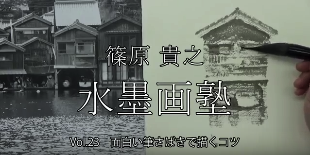 JUGEMテーマ:水墨画を学ぶ 動画 篠原貴之水墨画塾Vol.23 アップしました。 今回は 「面白い筆さばきで描くコツ。」です。 https://www.youtube.com/watch?v=3GN-xL6ecKw 水墨画家 篠原貴之のネット水墨画塾 第23回目は伊根の舟屋を題材にした「面白い筆さばきで描くコツ」をお送りします。 今回は舟屋を1軒だけピックアップして描き、筆使いと、窓や冊等、細部の描き方を見ていただきます。 面白い筆さばきで描くには、細部を単純化することが大切です。対象をシン...