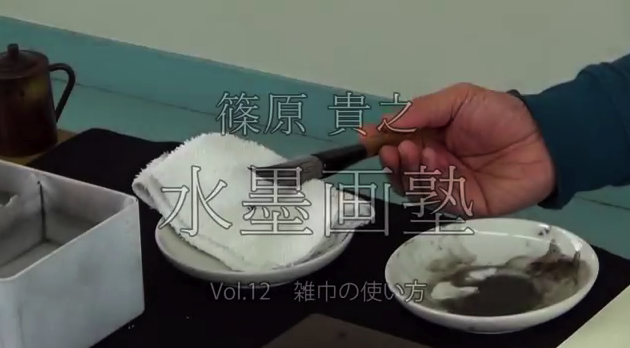 JUGEMテーマ:水墨画を学ぶ 動画 篠原貴之水墨画塾Vol.12 アップしました。 今回のテーマは「雑巾の使い方。」です。 動画 篠原貴之水墨画塾Vol.12 https://www.youtube.com/watch?v=loMvZ0H8M4I 雑巾は水墨画を描く際に欠くことのできない道具の一つです。 今回は雑巾を使って、筆の墨量や水分を調節する方法を解説します。